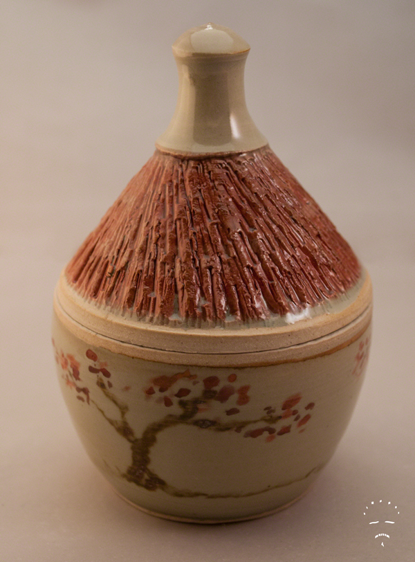 DSC_0066 Published July 17, 2016 at 600 × 812 in More Work From My Last Firing ← Previous Next → Small Cherry Blossom Jar: 3.375″ w x 5″ h. Red underglaze, Iron Oxide, Celadon